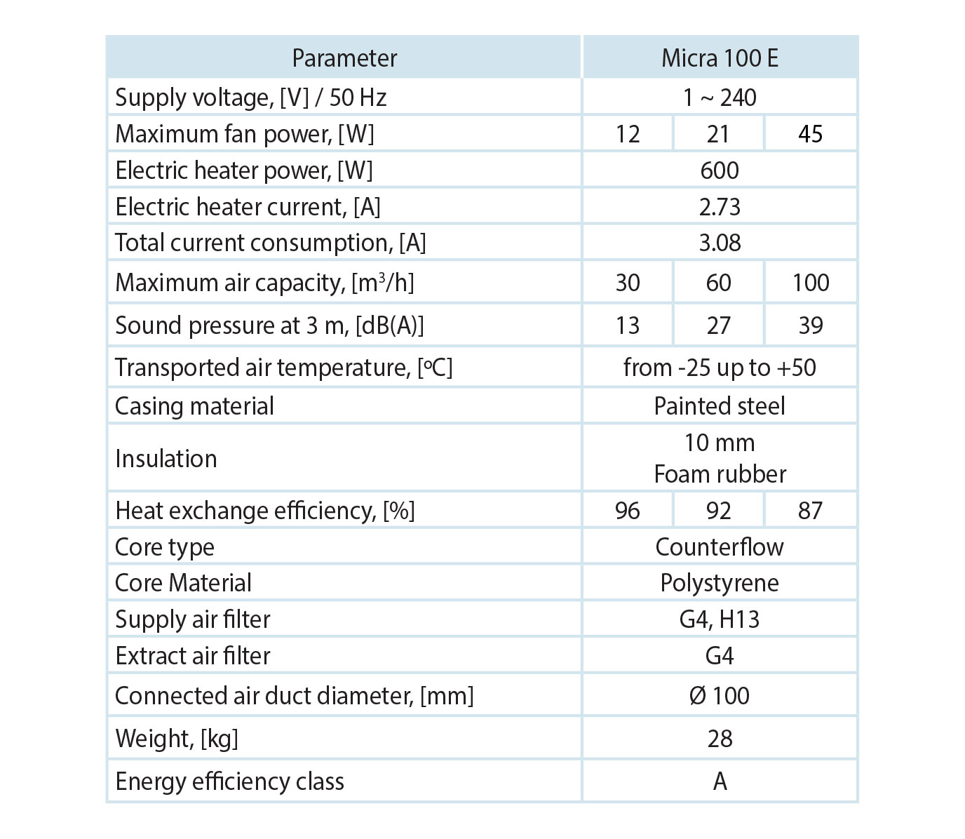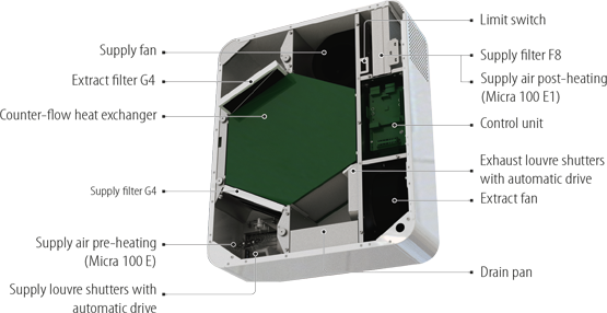 MICRA مجهز به یک مبدل حرارتی جهت بازیابی بیش از 90% انرژی از هوای خروجی ساختمان می باشد و به عبارت دیگر هوای تازه بیرون قبل از ورود به ساختمان از طریق این مبدل حرارتی صفحهای با هوای خروجی ساختمان تبادل حرارت داده (در زمستان گرم و در تابستان سرد میشود) و درجه حرارت آن نزدیک به دمای هوای داخلی میگردد و سپس وارد ساختمان می شود. این یازیافت حرارت و تامین هوای تازه به دو دلیل سبب صرفهجویی در مصرف انرژی میگردد.